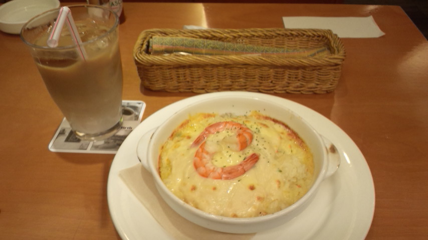 学生時代に見つけて以来、ドリアが美味しくて新宿に行くたびに覗いて、席が空いていれば立ち寄る喫茶店です。 駅構内にあるので、ゆっくりするというよりかは一服したり、ちょっと休憩するという雰囲気。 これも前から変わりませんが、全席喫煙です。 最近、どこも禁煙ばかりで、タバコを吸う為に入るサラリーマンなども多いみたい。 タバコの煙が苦手な私は、それだけがちょっとこのお店のイヤなところなのですが、それを我慢してでも行きたい!と思うような美味しいエビドリアがあるのです。 ランチタイム(曜日に関係なく、15:00くらいまでと結構遅い時間帯までやってる)に行けば、ドリンクセットで1000円以下と、リーズナブル! 店内はエビドリア以外のものを食べてる人ももちろんいるので、ドリア以外のお料理も美味しいようです。