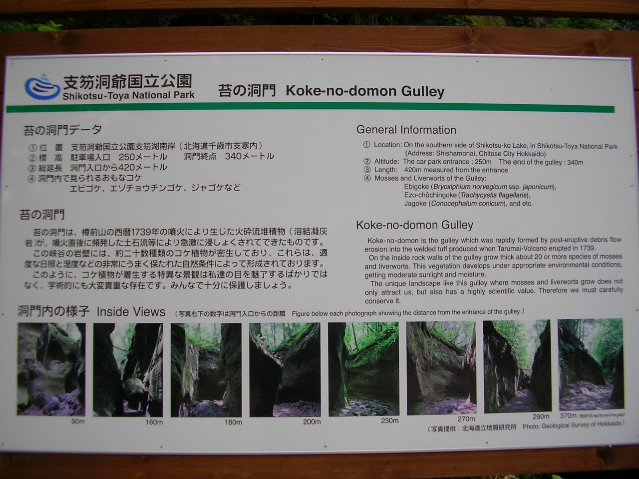 苔の洞門は、1739年(元文4年)7月の樽前山の大噴火の火砕流が堆積してできた溶結凝灰岩が土石流で侵食されてできた涸沢です。下流の第1洞門(延長約420?)と、その上流の第2洞門(延長約600?)で構成され、ともに両岸の岩壁がコケで覆われた回廊となっています。駐車場から入り口にたどり着くまで15分ほど歩きます。
