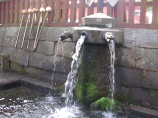 お参りした後、神社の石垣の下に行ってみると、山から引かれた清水があり、長いヒシャクで水が飲めるようになっていて、ありがたくいただきました。