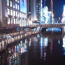 御堂筋にあります。橋といった感じはなく、道路です。道頓堀橋の上から、戎橋が見えるので、そちらの景色の方が美しいと思います。橋の上にはタクシー乗り場があります。南方面の一方通行なので、北に向かう場合は別の通りから乗車してください。