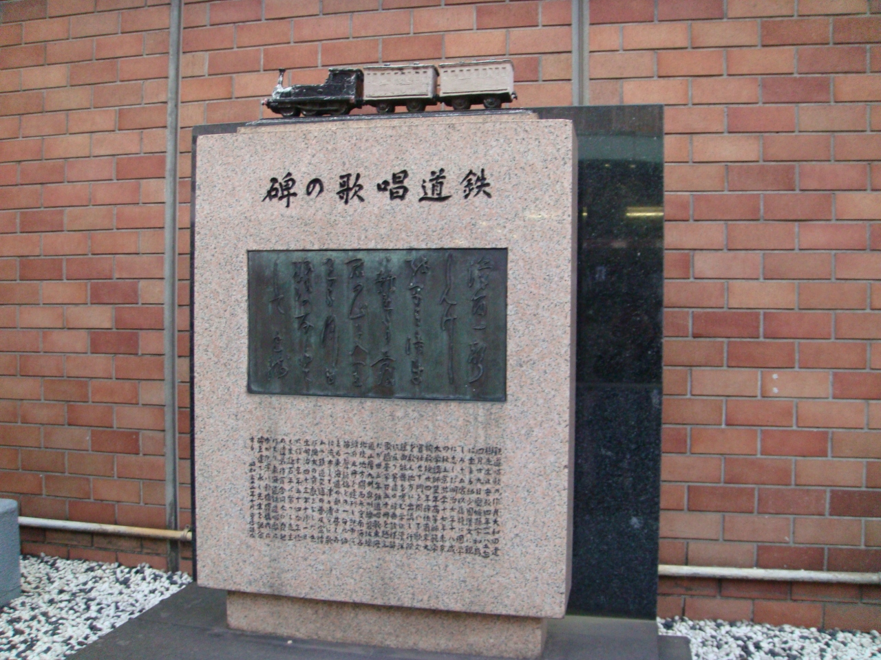 新橋駅汐留口に、「鉄道唱歌の碑」と「C-58機関車の動輪」が並んで建っています。