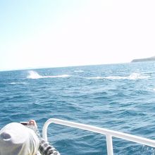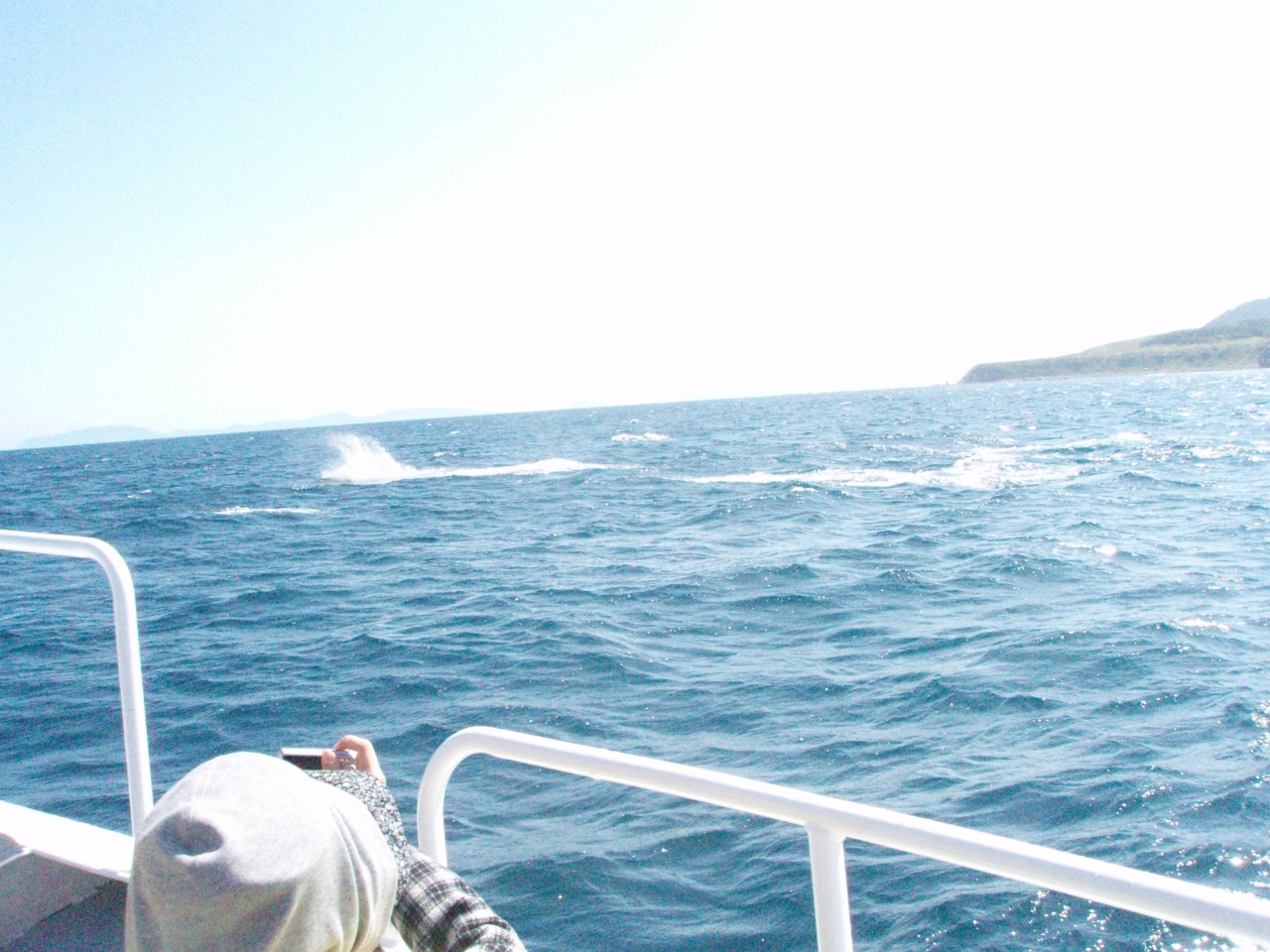 そして、知床岬の辺りまでいくとイルカの群れに遭遇しました。 (知床岬クルージングじゃないと行ってくれません) 岬の方まで行くと、ちょっと風が強くて、辺りの水深も深そうで寒かったですが、嬉しかったです。 ロシアの船っぽいのが微妙な距離で居て不気味でした。
