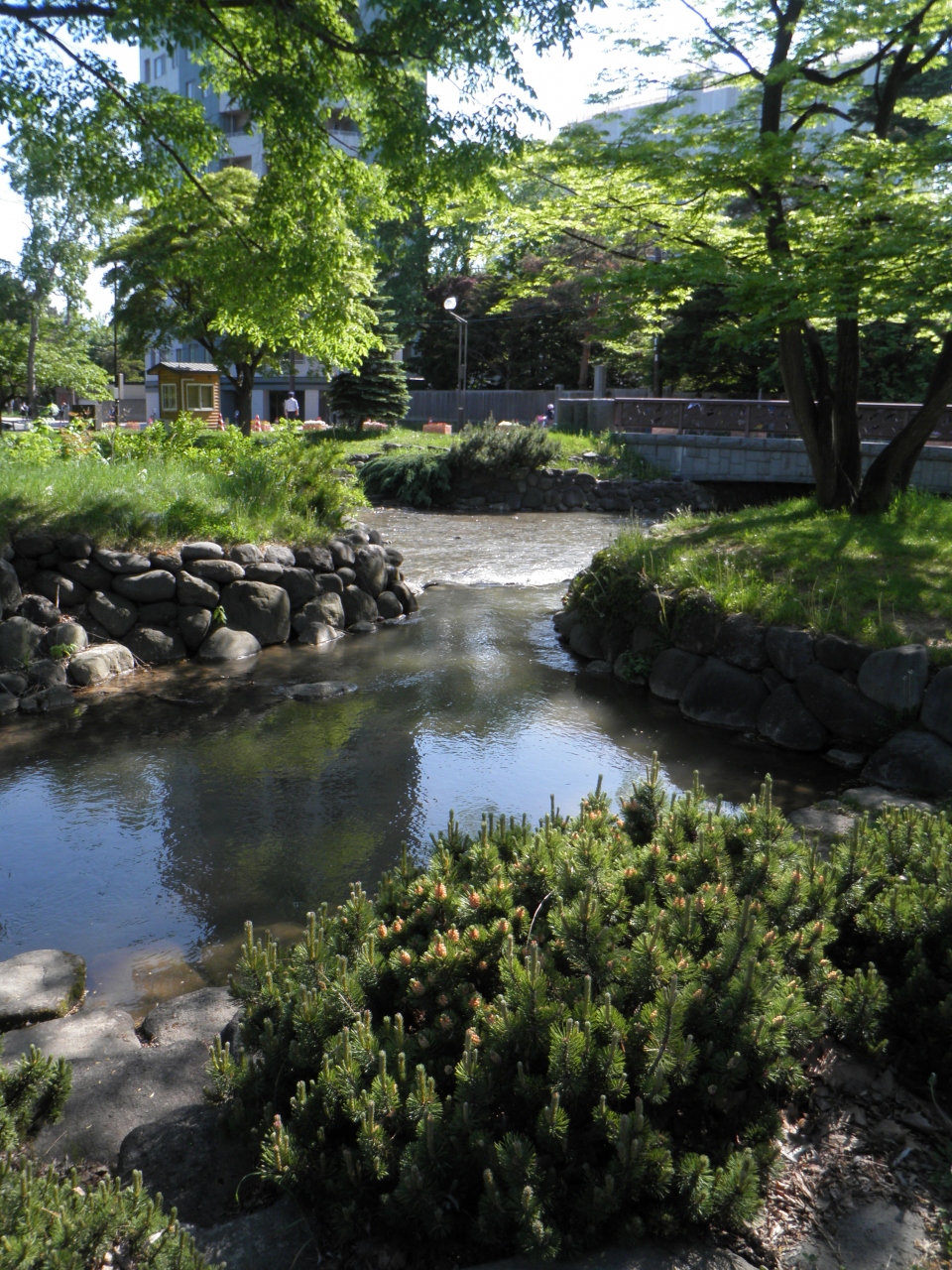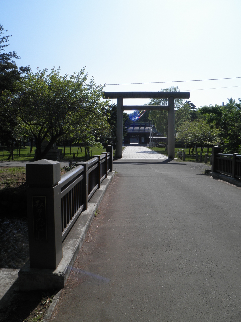 札幌市民の憩いの場中島公園と豊平川の間に、札幌護国神社があります。 小さな橋を渡ったところに鳥居があります。 周囲は緑の多い静かなところで、鴨々川の流れが緩やかに流れています。 子供を遊ばせる親水公園があり、春の休日を過ごすのにふさわしいところです。 落ち着いたカフェもあってデートにもいいかもしれません。