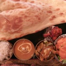 ナンが美味しいので時々寄せてもらいます。店内はインド感(インドに行ったことはありませんが勝手な思い)タップリでスタッフの愛想も良いし気持ちよく食事できます。ランチセットを頂きましたが、カレーが2種類にチキン、サラダ、ドリンク、ナンがついて900円でした。カレーは辛さが5段階あり、選べます。何回か食べた経験から、少し辛めを選んだほうが美味しいと思います。注文してから、釜で焼いてくれるナンは食べきれないほどの大きさがあり、モチモチとして微かに甘みがあり、本当に美味しかった。コスパも良いしお奨めのお店です。
