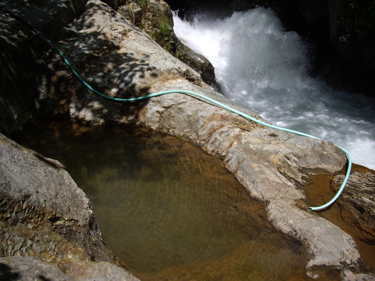 肝心の温泉ですが、川のわきの小高い岩のところに温泉が湧いている、という感じです。