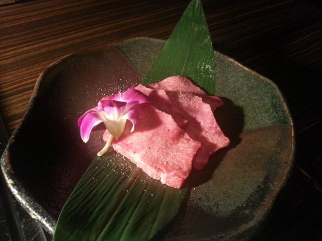 仕事帰りの主人と赤坂駅で待ち合わせをした。地下鉄出口7を出て、ひたすら雨の中を歩き、目的地に到着。傘をたたんでいる際にも数人の男性が階下に消える。入店すると直ぐに元気な声での出迎えがあった。既に店内は満室→みたところ、全て個室だった。 改めて予約が必要なお店だったと思った。席に案内されたが、初めてなのでどの位の量が提供されるのかが分らない。するとスタッフから「初めてですか?」と確認をしてくれ、お勧めを親切に説明してくれた。例えば「カルビは高いのじゃあなく、普通の値段でもうちのは十分美味しいよ!ただ、タンに関しては値段に比例すると思って下さい」など。(笑) 特に添付した写真では既に2枚食べてから写したので2枚しか写っていないが、厚切りのレバーを鉄板で炙ってペロリ! すご~~く美味しかった。スタッフのおかげで2人でお腹いっぱい食べて13500円だった。また、行こう~っと。