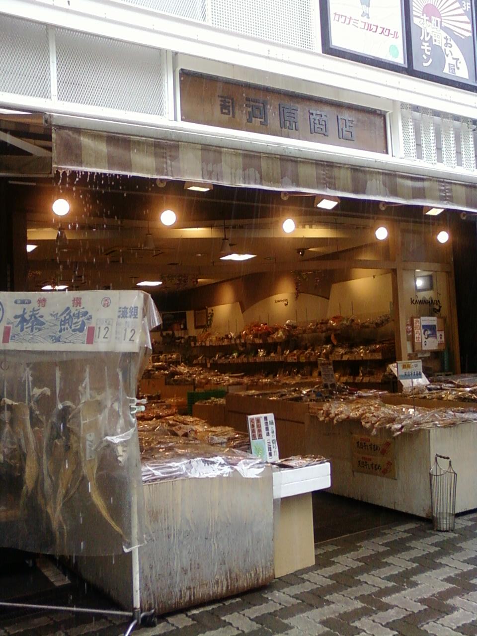 ここの河原商店さんは、小田急線およびJR町田駅から4,5分くらい、絹の道中央通りにあります。かつおふ節、わかめ、するめ、貝柱、海苔、いわしなど主に海産物の乾物の他、お茶も結構な種類を扱っています。店頭に棒鱈がぶら下がっていてびっくりしました。タイムトリップしたようで素敵でした。