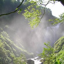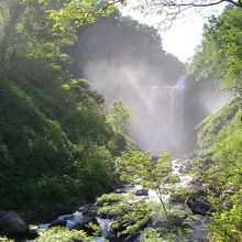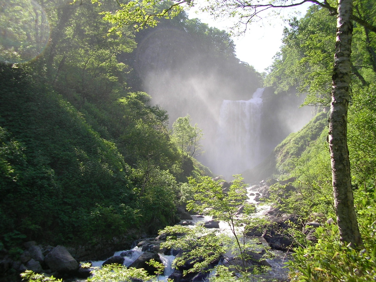 「賀老の滝」に行くにはかなり大変です。島牧村にある道の駅“よってけ!島牧”の近くにある、千走川温泉への道を経て、賀老高原を目指して15km(道の駅からトータルの距離)ほど行った所に駐車場があります。そこから徒歩で20分ほどで、やっと「賀老の滝」の観瀑台に到着します。滝は、落差約70m、 滝幅約35mの大きさで日本の滝百選にも選ばれています。滝直下に近付くことはできませんが、数百メートル離れた観瀑台でも滝のごう音が聞こえ、水しぶきが霧のようになってかかります。これまで、日本全国、沢山の滝を見てきましたが、豪快さと水量の多さにおいては、かなり上位に入る滝だと思います。付近は、クマが出そうで、アクセスも悪いところですが、ご覧になる価値はあると思います。