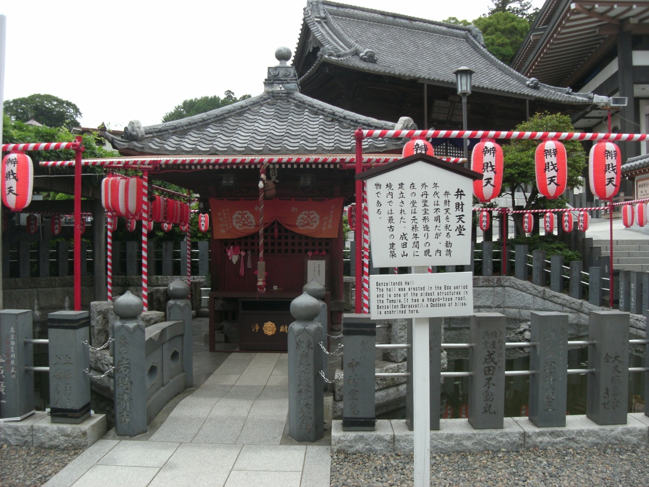 成田山新勝寺総門の脇手にあります。成田山境内にある建築物としては特に古いとされています。毎年6月の祭礼で弁財天尊の御開帳があります。財福・智慧・音楽をつかさどる仏さまですので信仰・お参りする方多いですね。