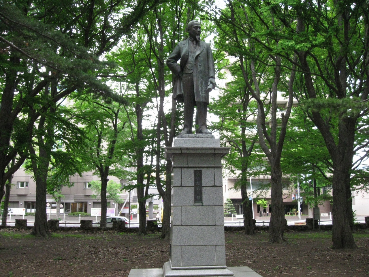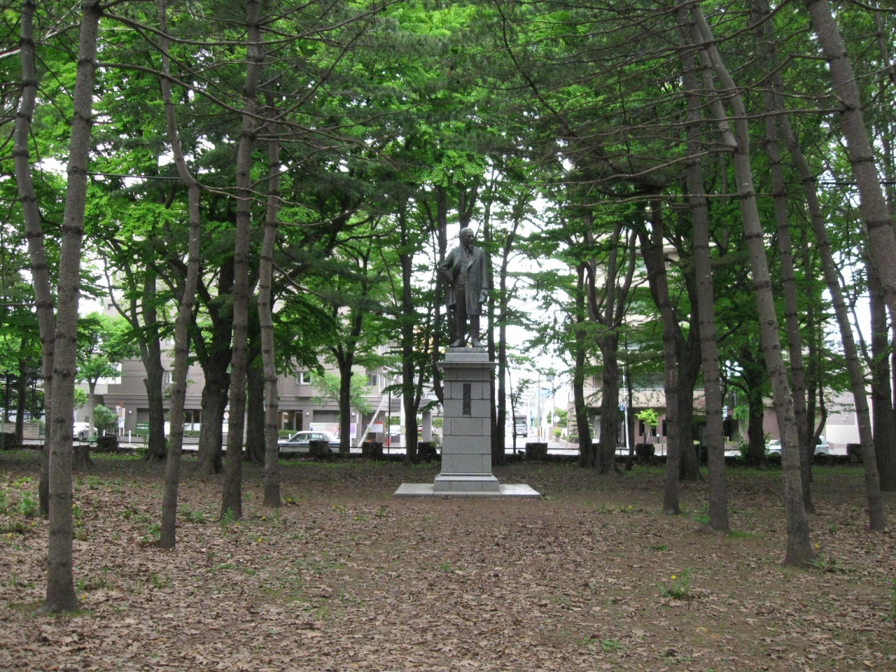 公園内からは、北1条通りに抜ける東側の園路を行くと見つかりますので、見つけたら園路を外れて像に向かって下さい。