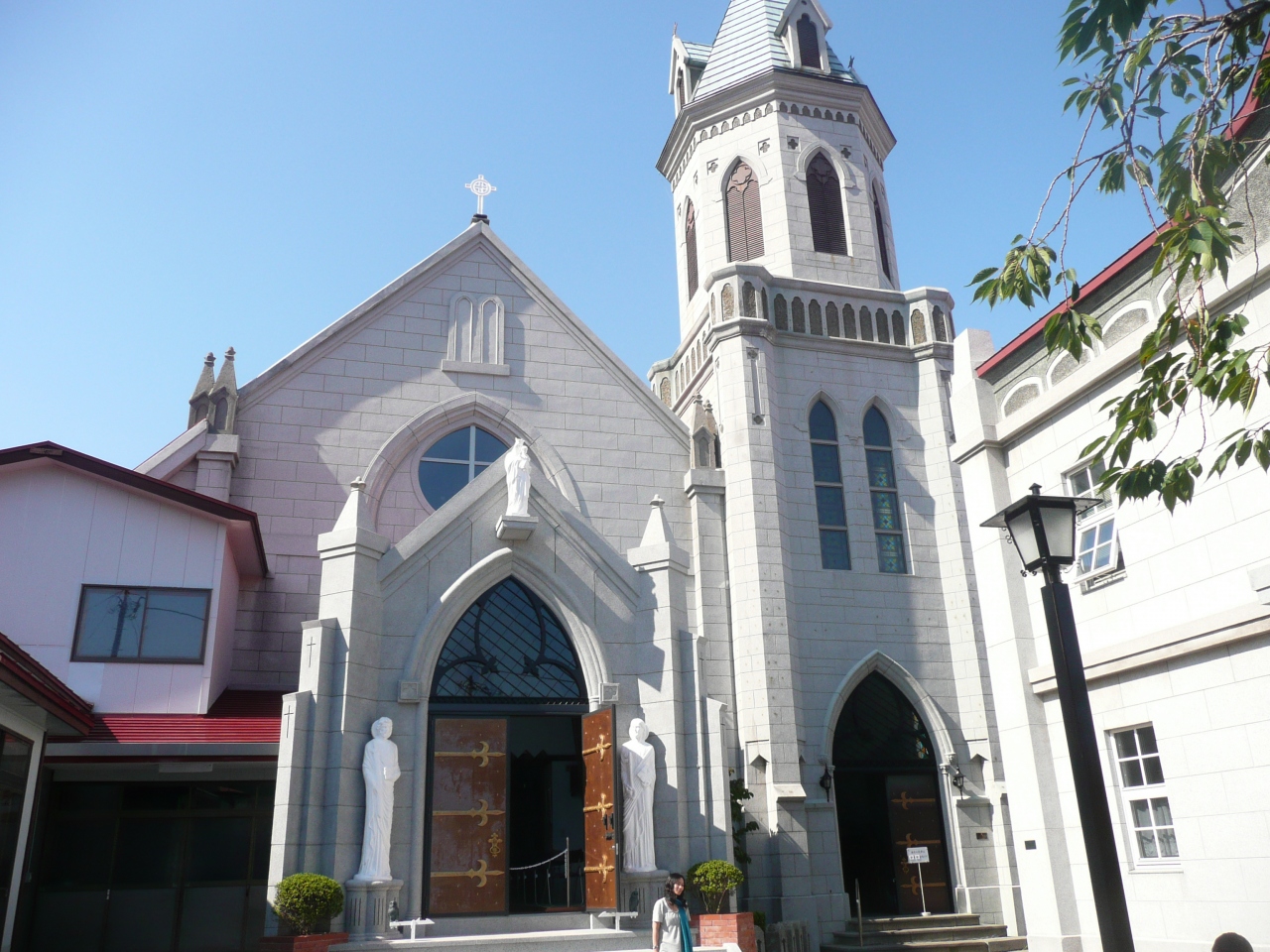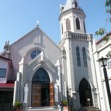 赤い屋根と尖塔が目立つ教会です。