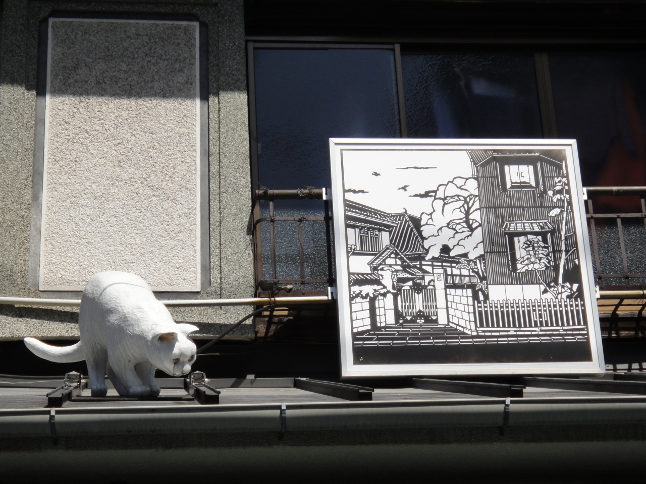石段を下った先が谷中銀座。なかなか活気のある商店街です。屋根の上に猫がいると思ったら人形のよう。谷中のシンボルなんでしょうか。ノンフライ焼きかりんとうの店があり、試食してしまいました。軽くておいしいです。