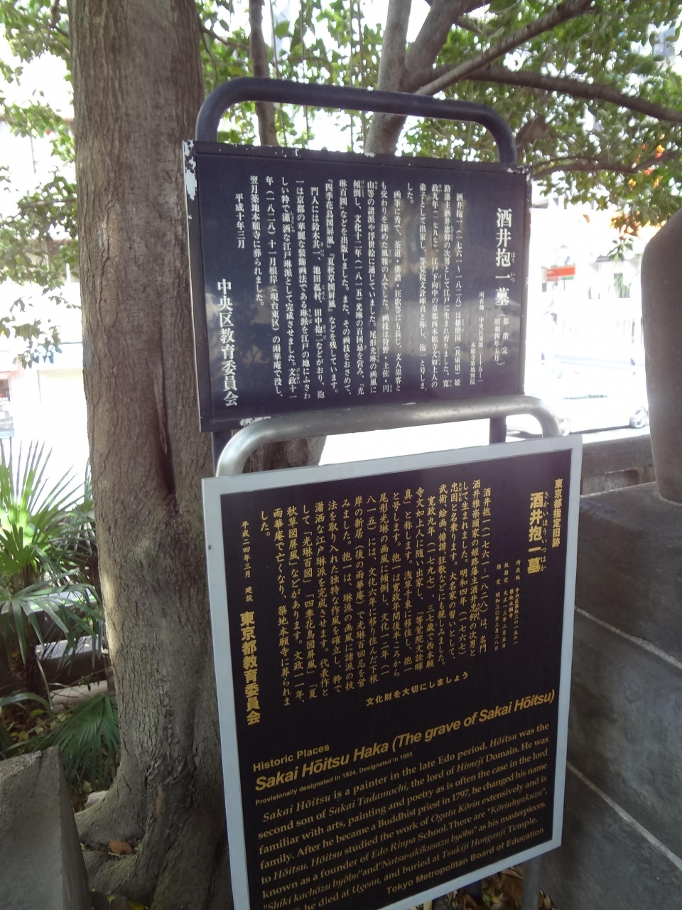 尾形光琳などとともに江戸時代末期に活躍した画家のお墓です。築地本願寺の正門を入って左側の木陰の中に他の方の句碑や供養塔と共に立てられ、説明板もあります。酒井抱一は西本願寺で出家し権大僧都となりましたが、江戸で隠棲し生活を送っていたそうです。