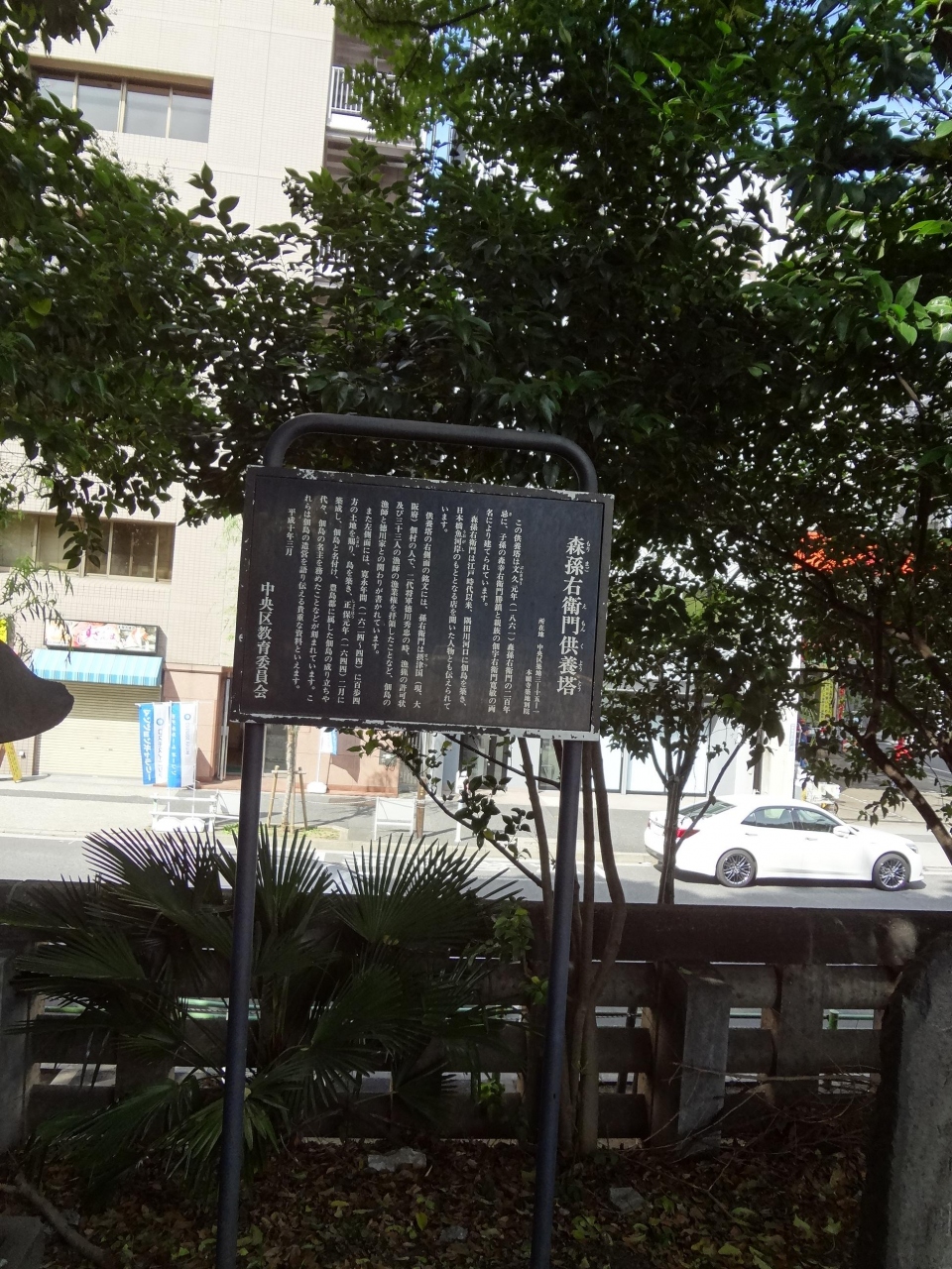 築地本願寺正門を入り、本堂に向かって左側の木陰に建てられている供養塔です。森孫右衛門は徳川家の食膳に供する白魚御用というお役目を務め、また佃島を築き、日本橋魚河岸のもととなる店を開いた人物と、伝えられているそうです。供養塔は1861年に二百年忌に建てられたそうで、説明板には佃島の成り立ちも書かれています。