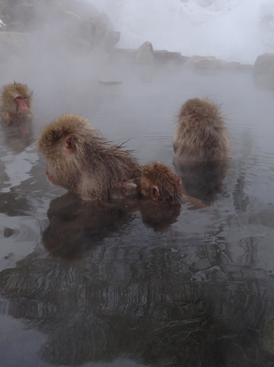 長野駅から長野電鉄「湯田中温泉」駅からバスにのり、下車してから30分歩いて(しかも雪の山道)ようやく到着です。苑内はいたるところに猿が元気に走りまわってます。ここが有名なのは猿が温泉に入るからです。大勢の観光客が温泉に入っている猿の撮影をしてました。アクセスは少し大変ですが、行く価値はあると思います。