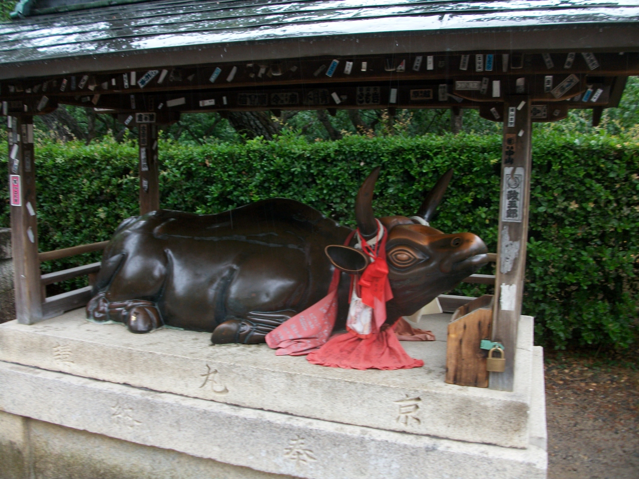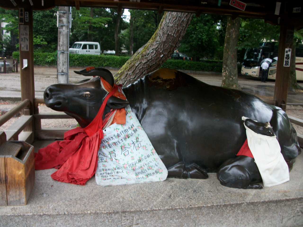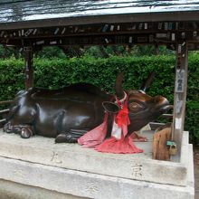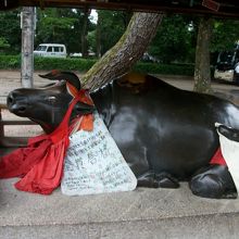 また、参道には何頭もの牛の像があり、牛の前掛けにも