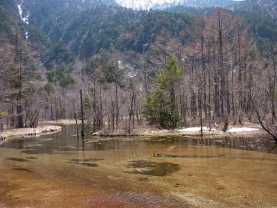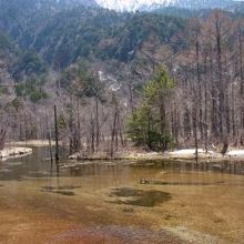 田代池はは隣接する大正池とともに、大正時代に焼岳の噴火により流れ出た溶岩が梓川左岸の支流である千丈沢をせき止めたことでできた浅い池で、周囲は湿原になっています。