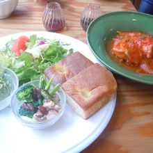 ランチはワンプレートにフォカッチャやサラダやお肉料理が盛り付けされていてお