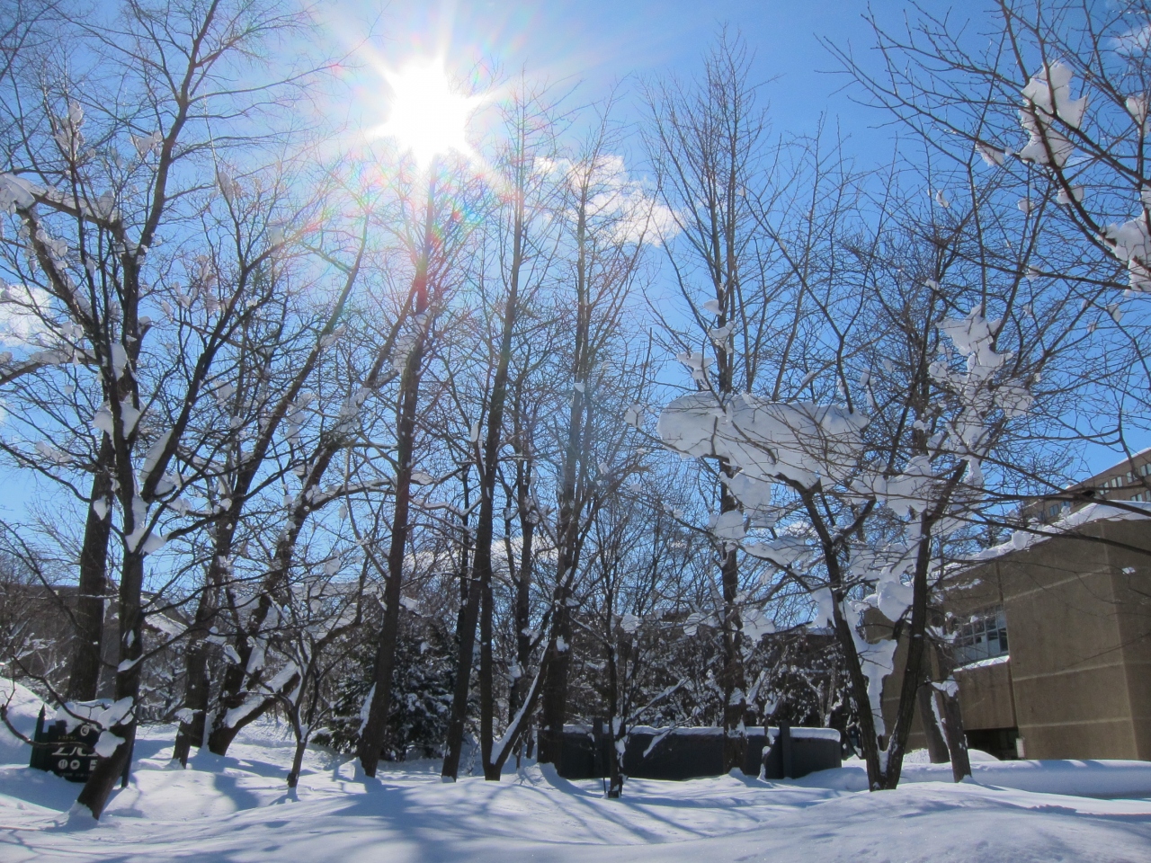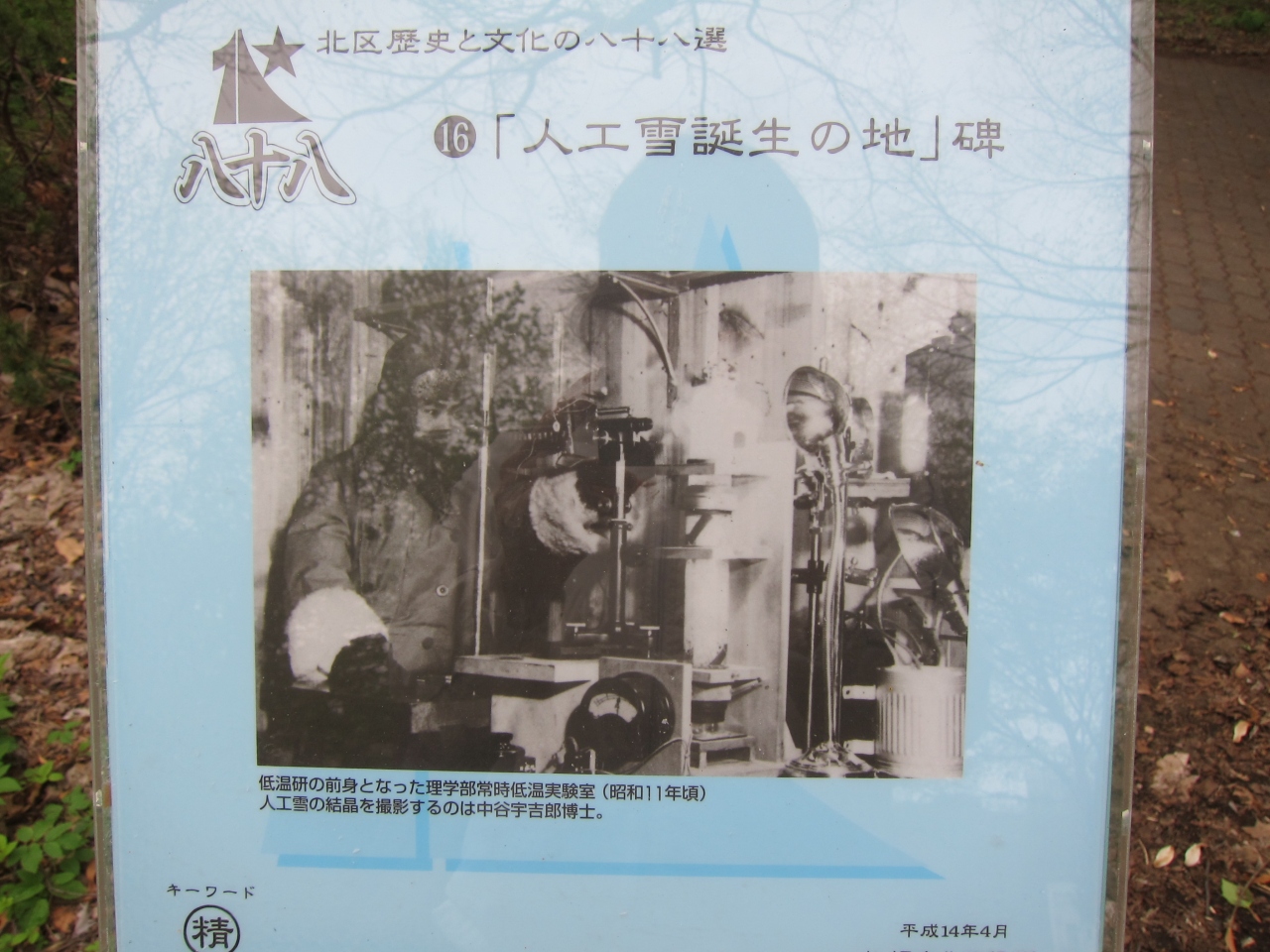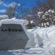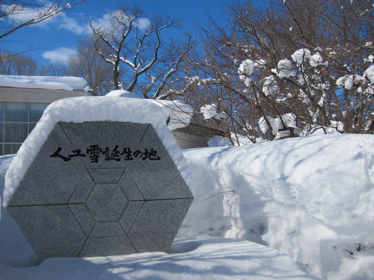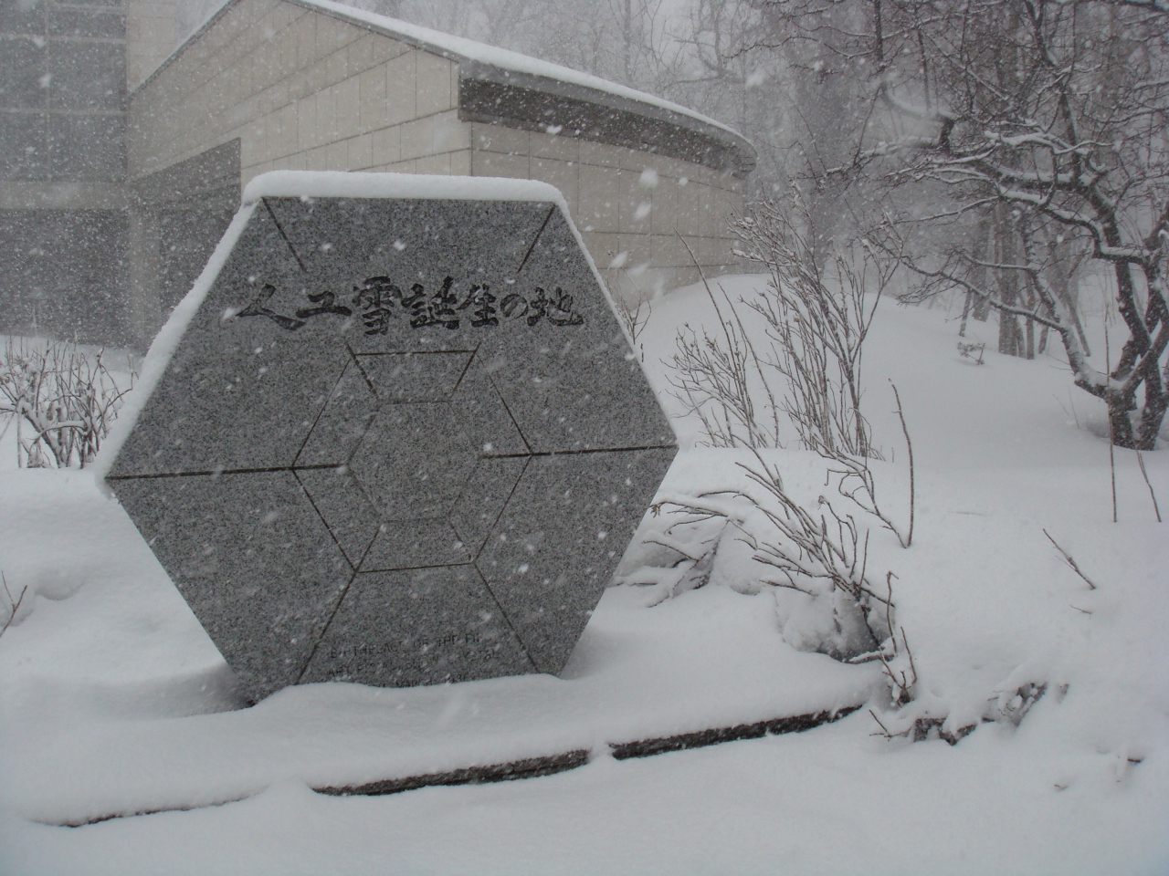 北海道大学の構内にあります。場所は大学を南北に貫く中央道路沿い、総合博物館の先のレストランエルムの辺りにあります。昔、この場所に人工雪を作り出した中谷宇吉郎博士の研究室があったそうで、六角形の雪の形をした碑が建っています。近くに大野池があり、北海道大学構内の散策の憩いの場となっています。碑の裏手のレストランエルムや大学生協の食堂で一休みしていくのも良いと思います。