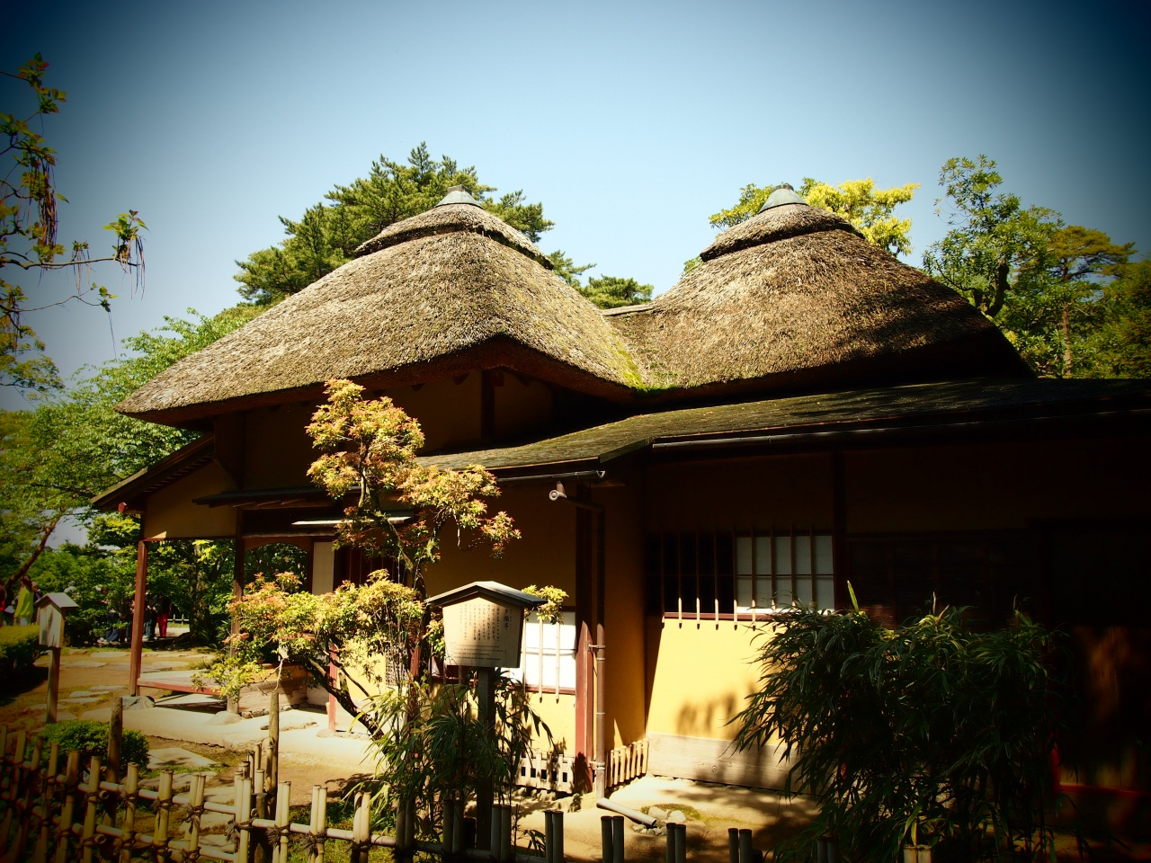兼六園の、瓢池の周りを歩いて見学していたところ、見つけた茶室。 園内に現存するもっとも古い建物だそうで、1774年に建てられたそうです。 外から見学するだけなのですが、それでも十分歴史を感じることが出来ます。 季節的にしょうがないのかもしれませんが、私が訪れた5月の日はかなり暑くて、夕顔亭の藁葺屋根の周りを無数の虫が飛んでいました…。
