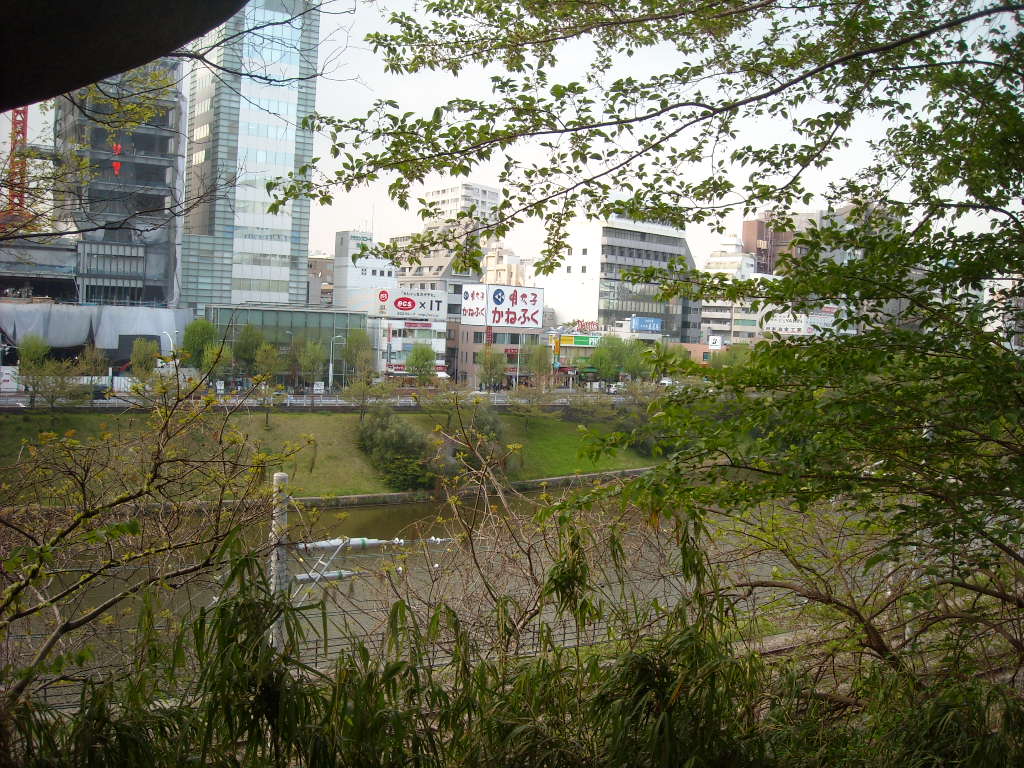 公園のすぐ下には線路、濠があり、その向こうにはビルが立ち並んでいるのが見えます。