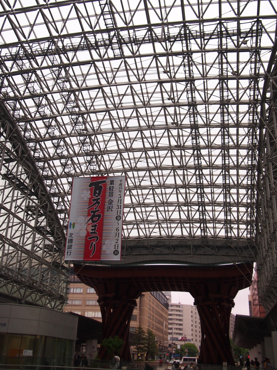 JR金沢駅の東口を出ると、まず大きな鳥居型の門に圧倒されますが、その門と駅舎をガラスのドームで包む建物です。 私が行った時は生憎のお天気でしたが、日の光が入るのでとても明るくて良いです。 ドーム型になってるスペースがかなり広いので、待ち合わせなども楽に出来て良いと思います。