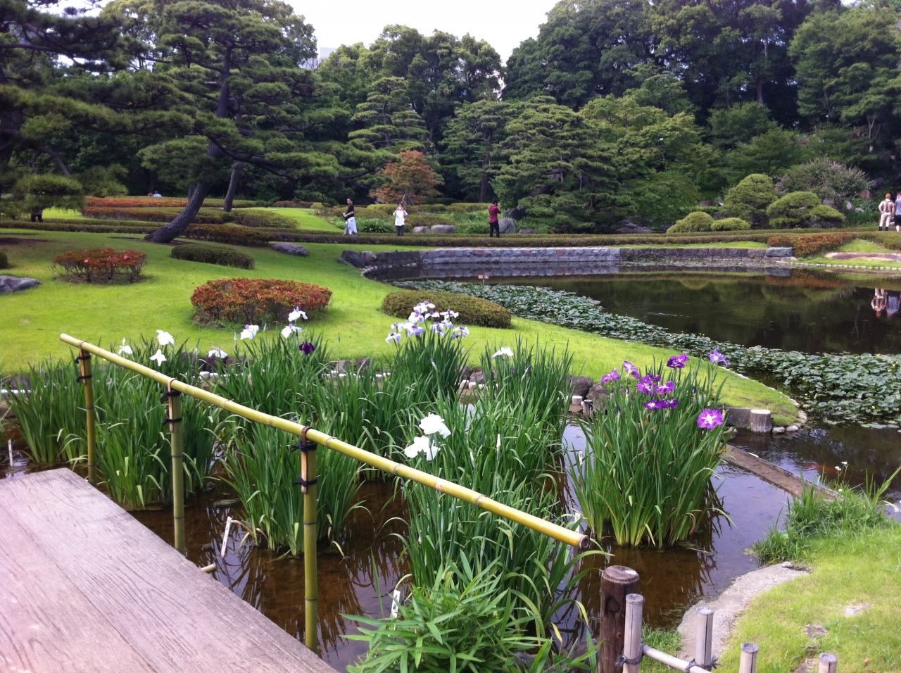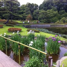 池には鯉も泳いでおり、小さな滝や立派な松の木やハナショウブの花が綺麗です。