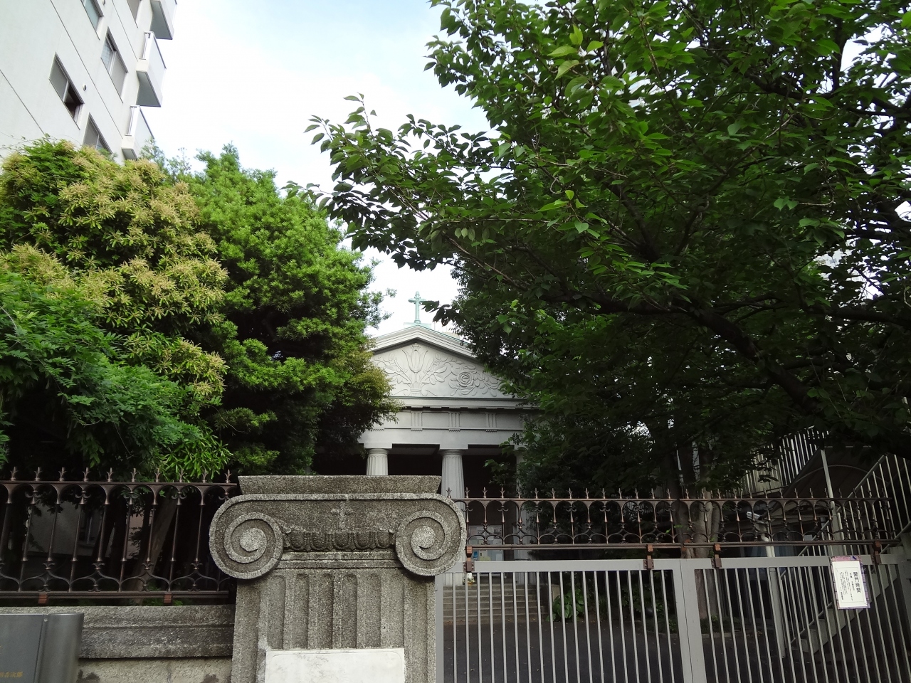 明石小学校の向かい側に立派な教会があります。もともとは明治11年に、築地にゴシック様式で赤レンガ造の聖堂が建てられましたが、関東大震災で焼失したそうです。現在の建物は昭和2年に再建されたものだそうです。石造りのファサードだと思っていましたが、木造建築で、壁面はモルタル塗りとなっているそうです。