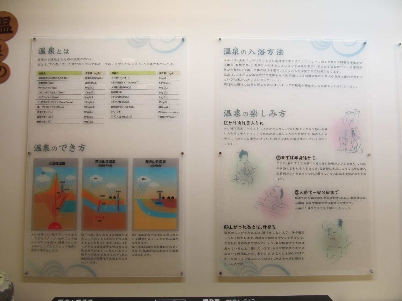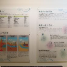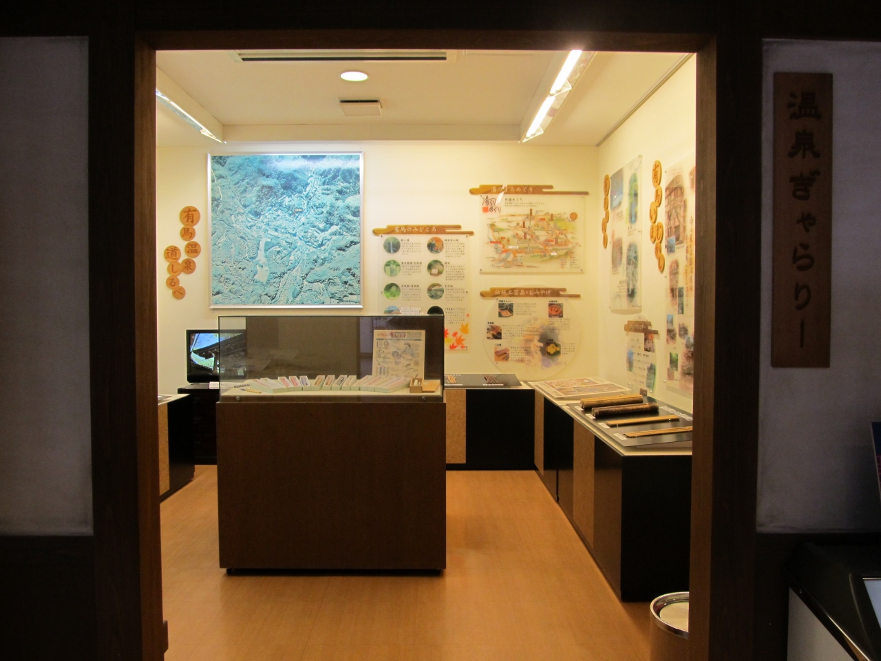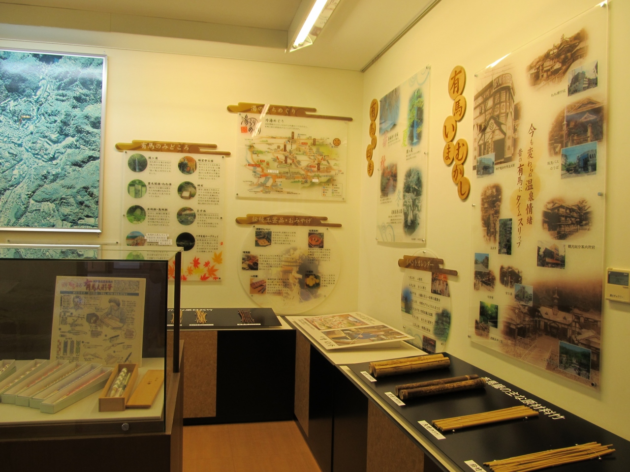 有馬の見どころ、伝統工芸品、湯のまちめぐり、有馬いまむかし、温泉の入り方等をパネルで展示している。