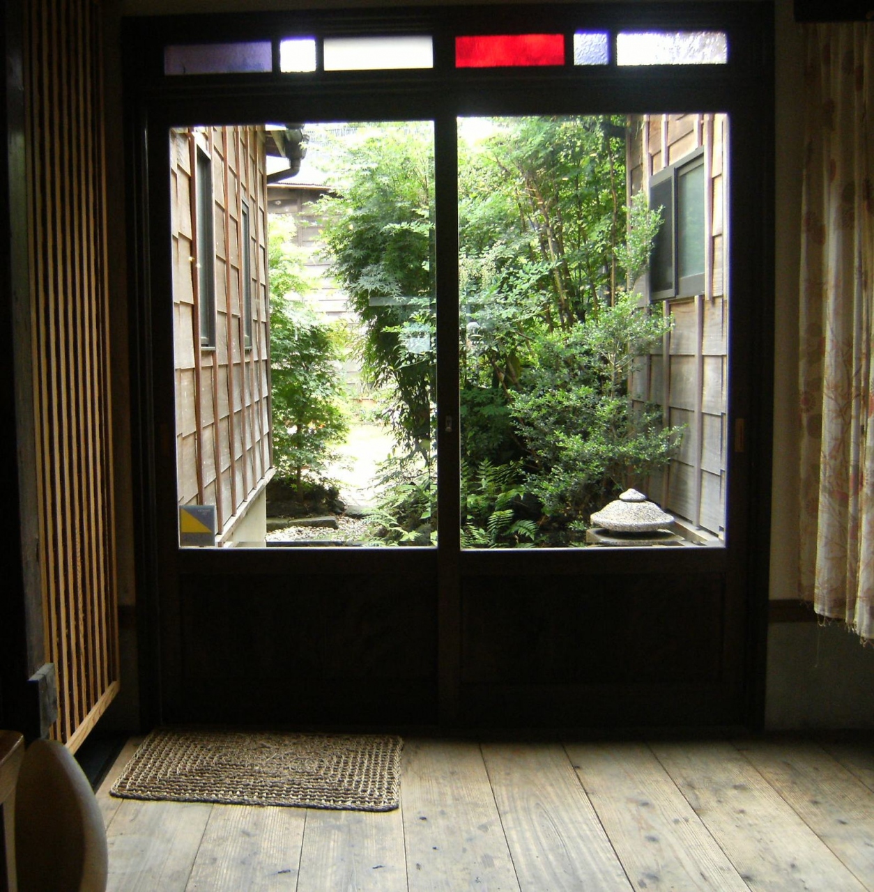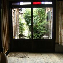 商家改築のカフェで、天井が高く、照明も抑制が利き、裏庭の緑が絵画的である。