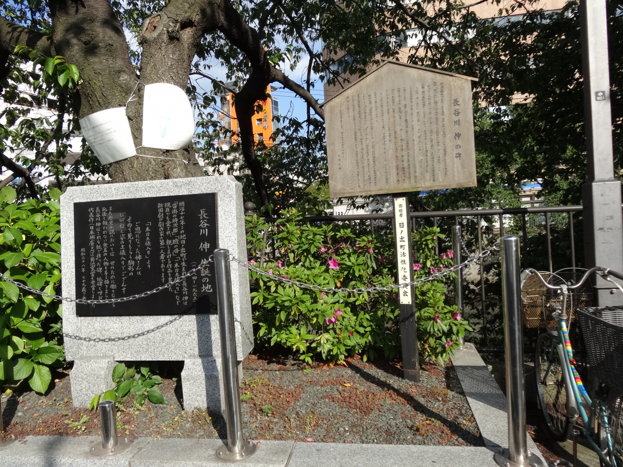 大岡川沿いに設置されている、作家の長谷川伸の生誕の地を説明する碑です。