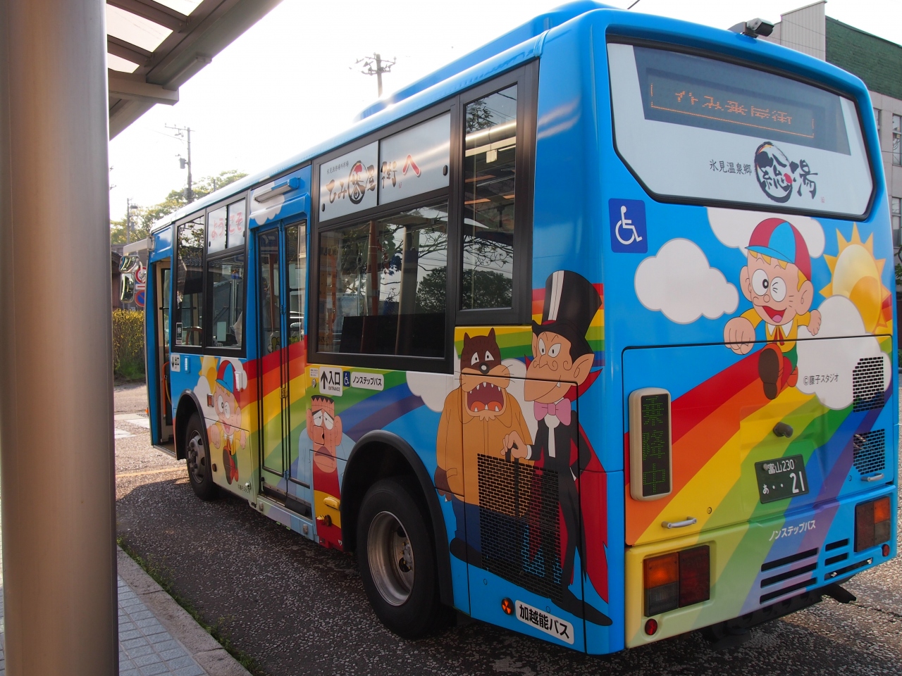 駅では、ハットリくんに会える街!ということで商店街MAPを配っていますので、是非もらいましょう。 電車の時間に合わせてひみ番屋街までのバスが運行されていて、運賃も1回100円(子供50円)と安いのが嬉しい! ちなみに、バスは怪物くんのペイントでした!