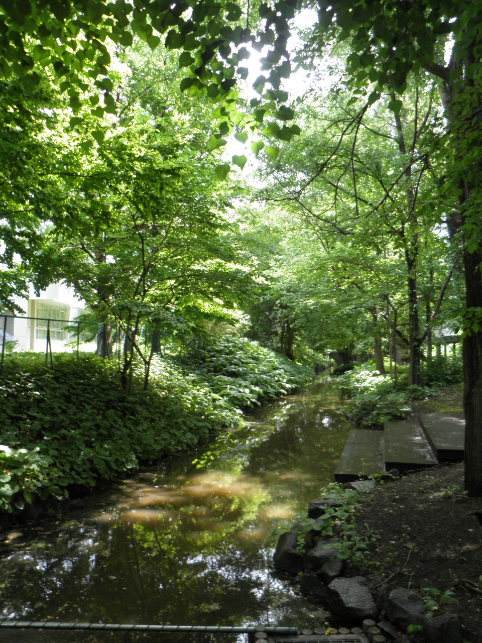 6月中旬になって北海道大学のキャンパスの緑も鮮やかになってきました。 大野池の近くに六角形の人工雪誕生の地碑がたっています。 池の周囲にはベンチがあって公園みたいになっています。 道路の向こう側には、小川が流れていて遊歩道があり、のんびり散歩するのにいいです。