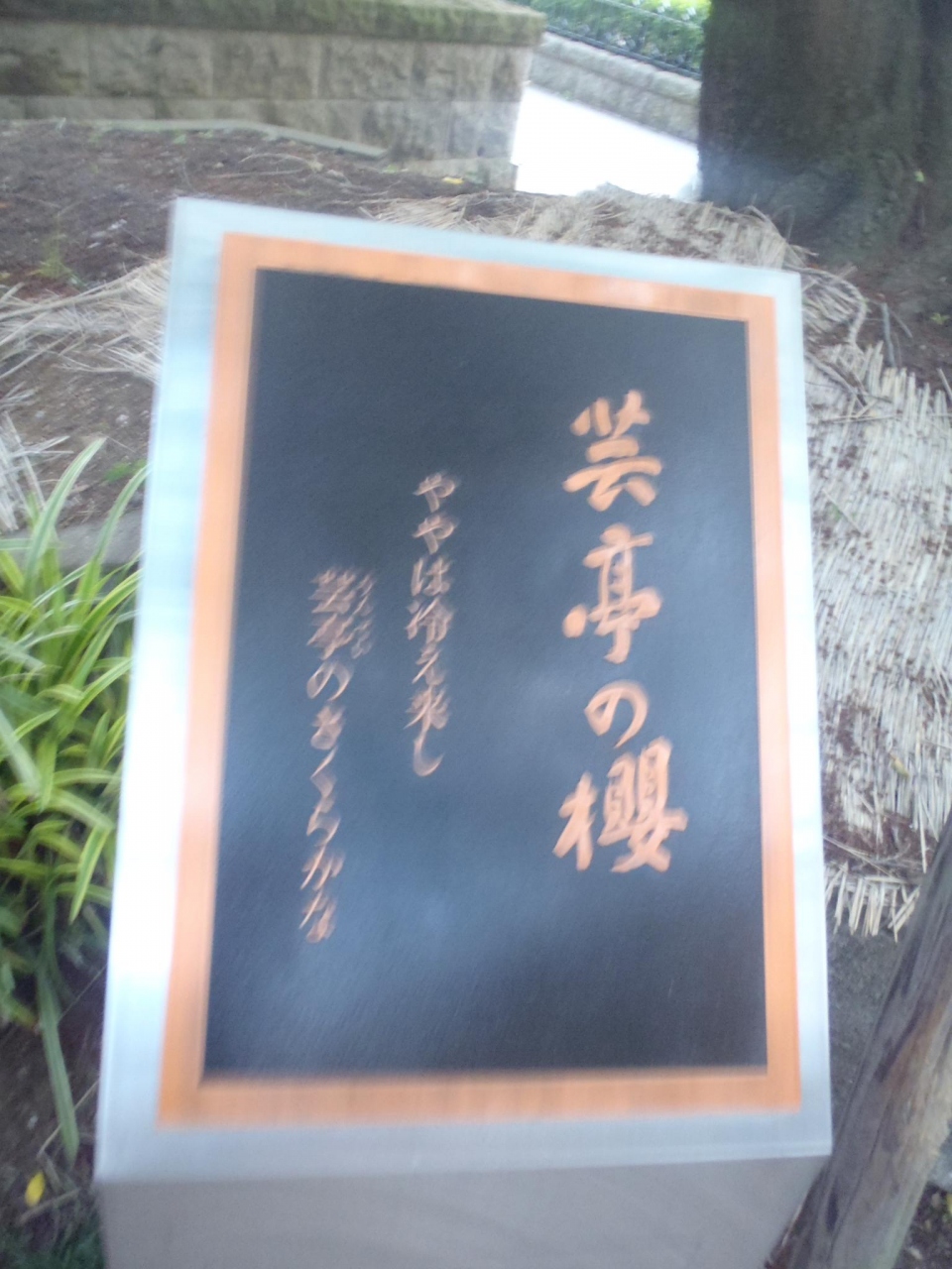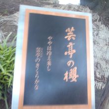 毎年この桜の花見の会を館で催していたあるとき、文学者の集いらしくこれを「芸亭の桜」と名付けようということになり、平成9年4月、中野孝次氏が書いた字を銅板にとって桜の下に建てられました。