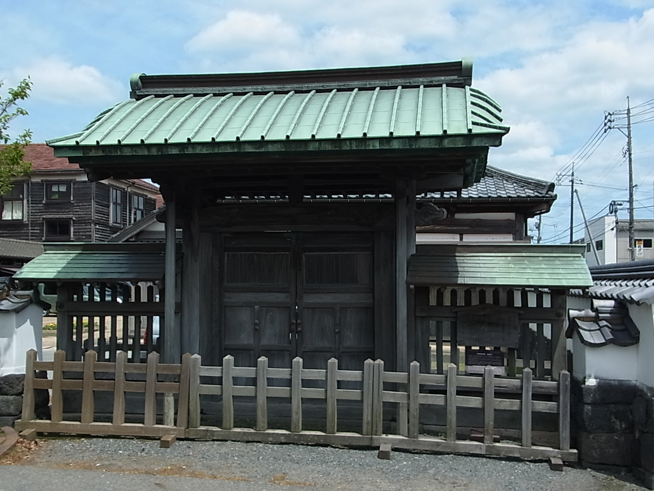 形式は木造瓦棒銅板葺き、左右に唐破風を備えた平唐門で、桁行2.5m、梁間1.45m、両袖に連子格子の塀をつけています。
