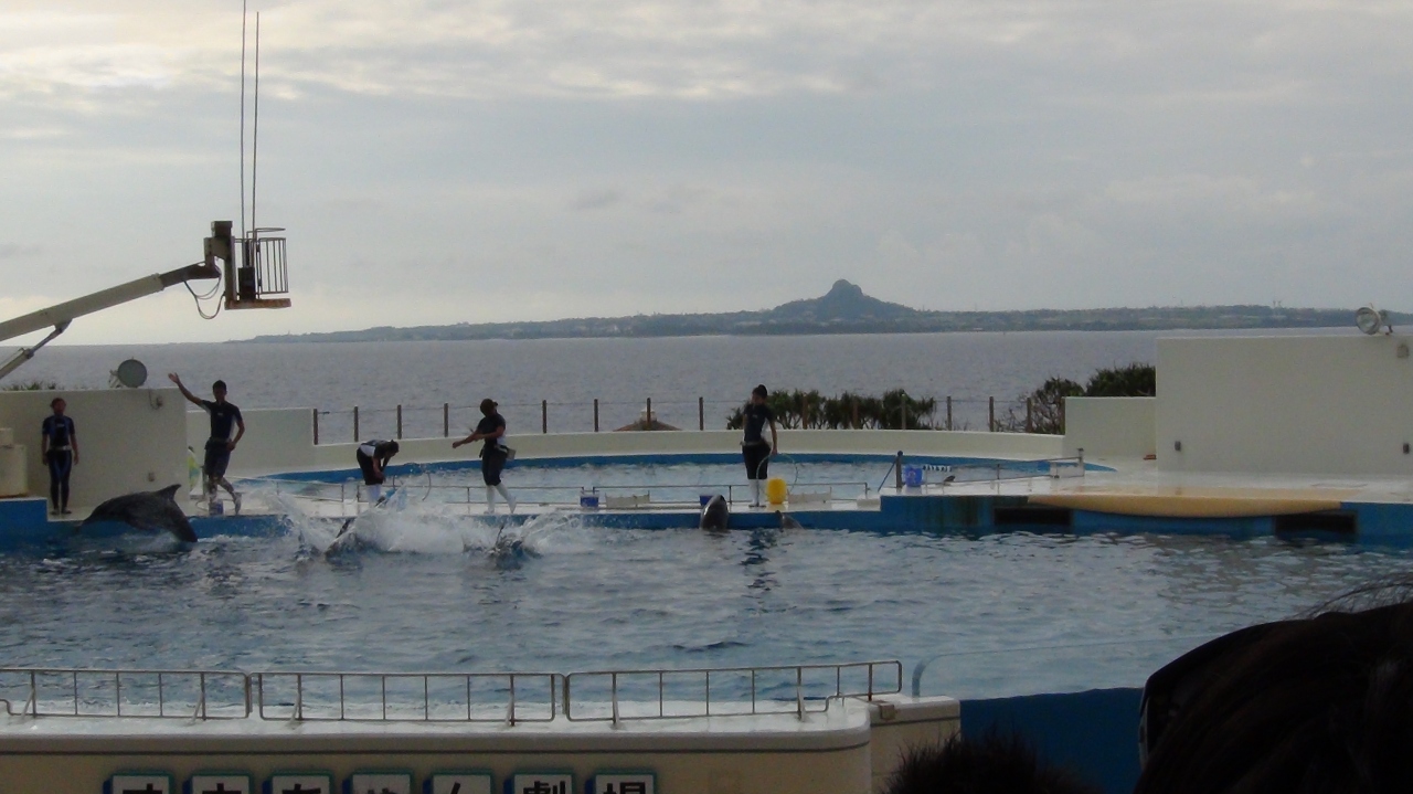 美ら海水族館からは少し離れたところにあります。ショーが始まるよりかなり早めに席を確保しておかないとすぐにいっぱいになります。ショー自体は他のイルカショーと比べて大差はありませんが、イルカショーのバックに見える景色がすばらしかったです(笑)