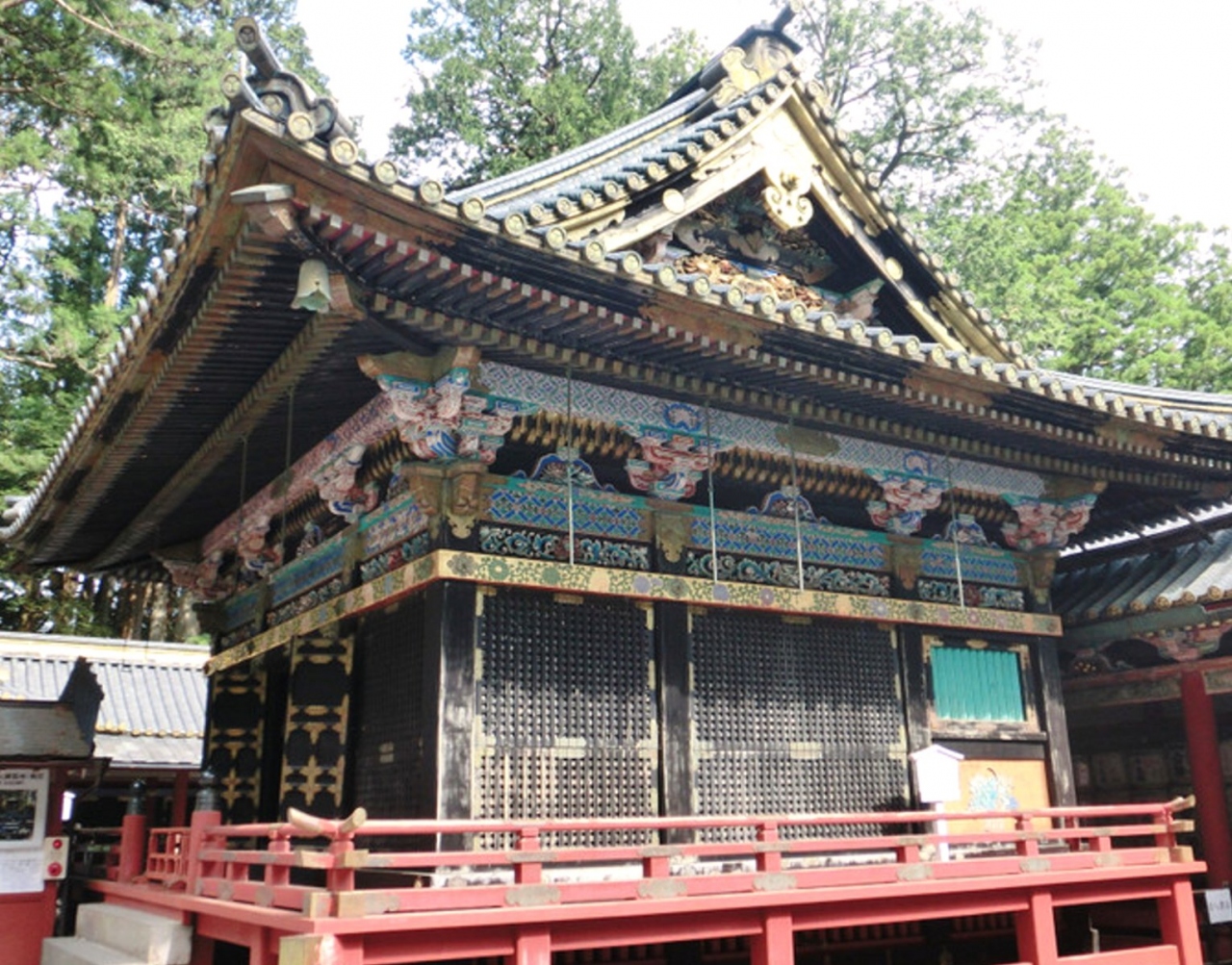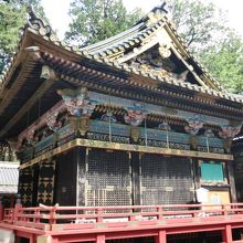 神楽殿は国指定重要文化財に指定されて、黒と金を基調とし高欄は大変きらびやかな建物です。さすが日光東照宮て感じですね。この神楽殿では、春秋 の大祭の時に八乙女が神楽を奏するところだそうです。日光東照宮ではあちらこちらが国宝や重要文化財なのでうっかりしていると見逃してしますので注意が必要です。