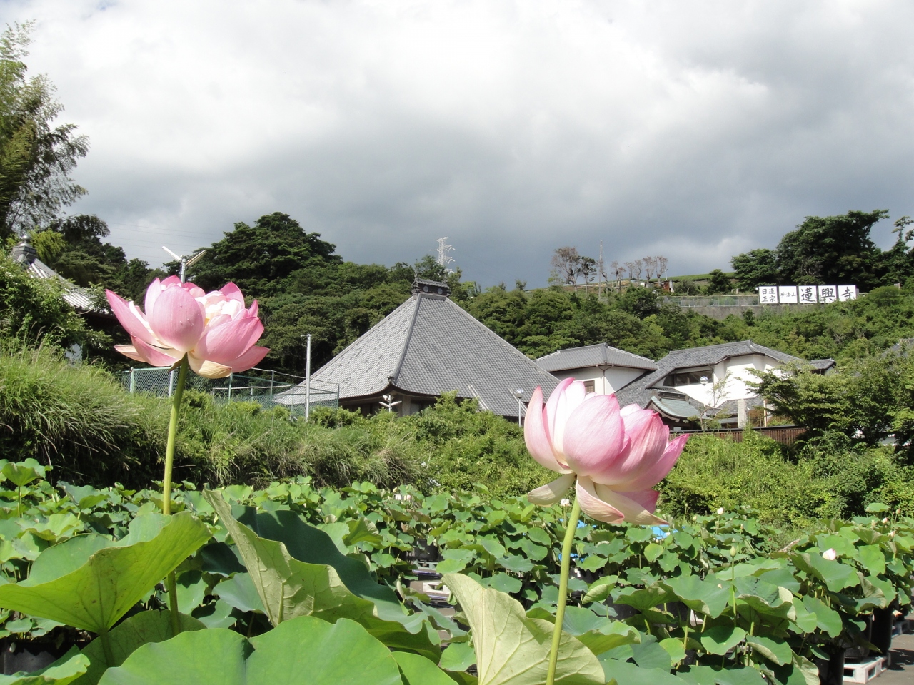 こちらのお寺は、蓮の花が見事だと紹介されていたので初めて訪れました。場所は細い道路を通った静かな山の中にあるのですが、日蓮正宗の立派なお寺です。お寺に入る手前に“白蓮香苑”という一角があり、鉢に植えられたたくさんの蓮の花が見ごろを迎えていました。蓮の花というと、池に浮いている蓮の花をよく見かけますが、このように道路の上に鉢植えにして置かれたものは初めてで、ある意味とても新鮮でした。鉢植えといっても、ものすごく広いのであたり一面が蓮の畑のようです。訪れたのは6月の半ばで、まだ時期的に咲き始めたばかりだったのでこれからがもっときれいだと思います。ピンクだけでなく、白色の蓮も見られます。午前中がきれいに見られるチャンスだそうです。