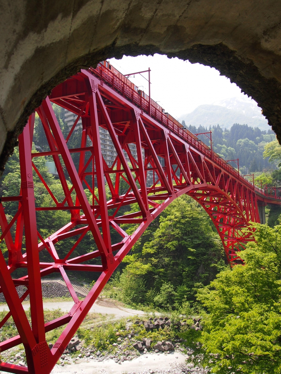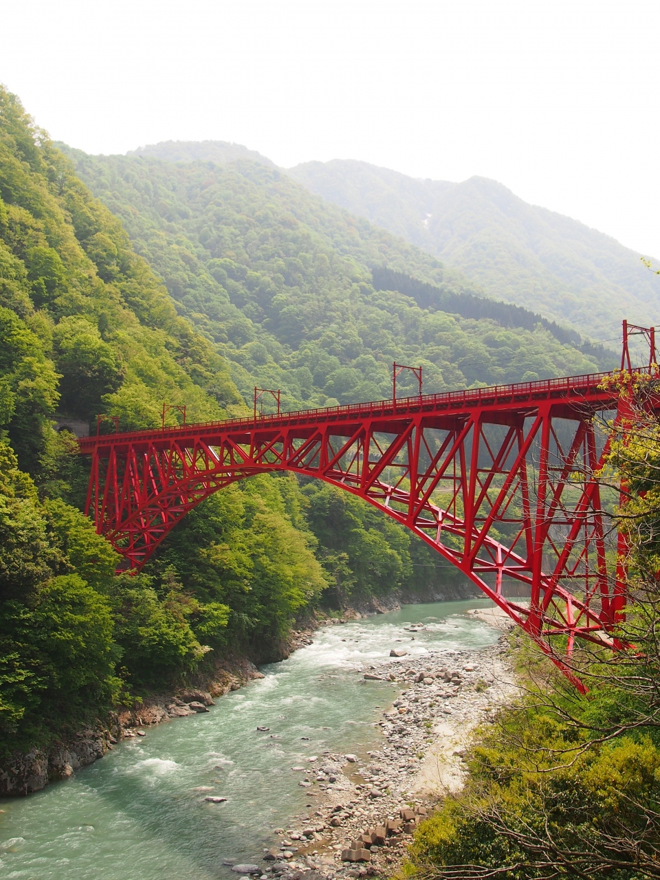 宇奈月駅からのトロッコ電車に乗って通る立派な赤い橋。 この橋と周りの景色を良い具合に写すことが出来るスポットは、歩行者用の橋で、山彦橋です。 トロッコ電車が思ったよりも頻繁に運行されていたので、新山彦橋を通過するトロッコ電車と一緒に撮影するのチャンスも何度もありました。 今度は秋の紅葉の時期に見てみたい!