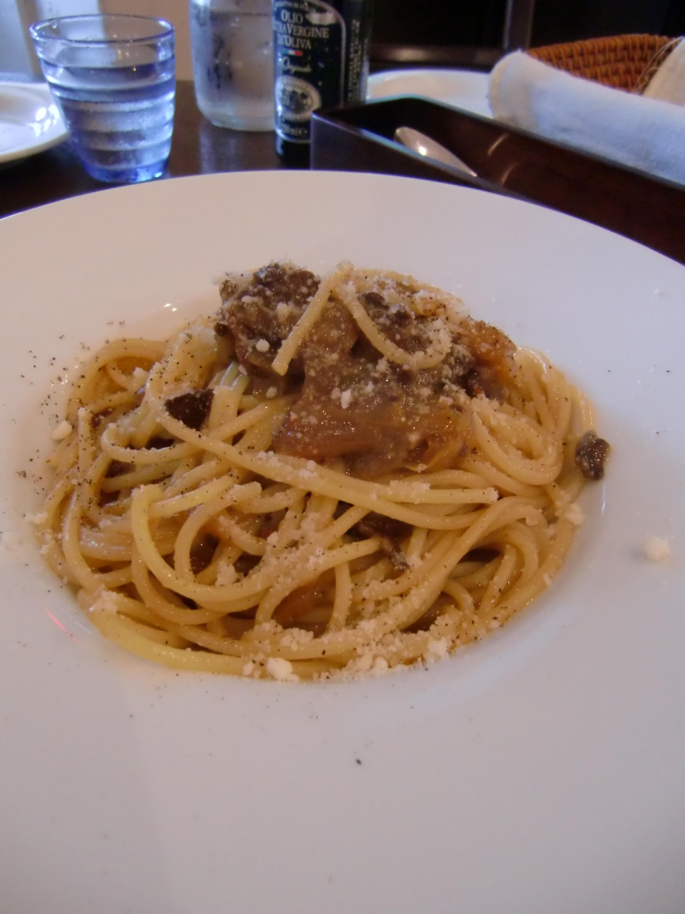 地下鉄池下駅から少し歩いた住宅街の中にあるお店です。ランチタイムに利用させていただきました。店内は赤い壁にモノクロの写真が飾られ、大きなピザ窯がガラス越しに見ることができます。前菜+パスタ(またはピッツァ)+ドリンクの「アマルフィコース=1570円」にドルチェを追加しました。この日のパスタはアラビアータとナポリ風ジェノベーゼ。ジェノベーゼといってもバジルを使ったパスタではなく、玉ねぎと牛肉を使ったパスタでこれがとてもおいしかったです。