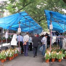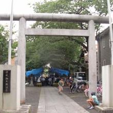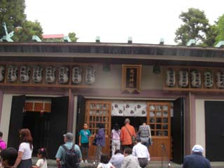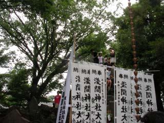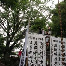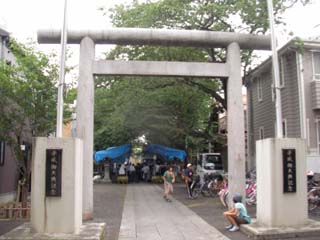 池袋駅の北口から商店街を進んで、下板橋駅の近くに氷川神社があり、参道では朝顔市をやっています。さらに進んで、茅の輪くぐりをして本殿に参拝し、隣にある富士塚に行列が出来ていて7月1日のお山開きのときだけ登れます。