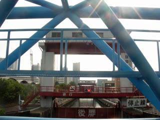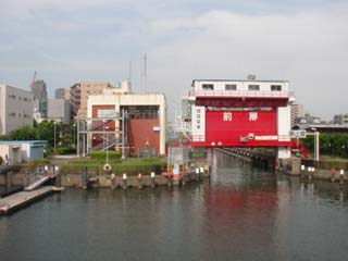 木場公園を通って住吉駅に向かう途中で渡った扇橋から小名木川にある扇橋閘門(おうぎばしこうもん)がありました。東京のパナマ運河と呼ばれていて、隅田川より小名木川の水位を低く保つために作られた施設で、前門と後門の間で水位の調整をしています。毎年8月に一般公開されています。