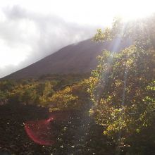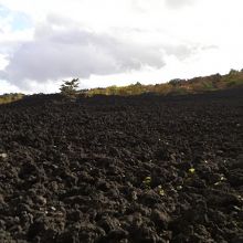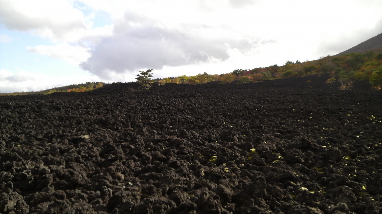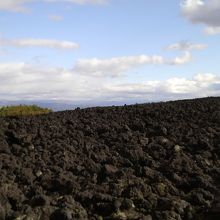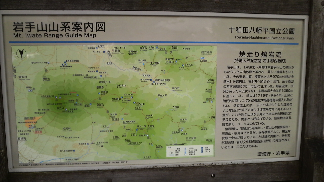 溶岩流の流れが冷えて固まり、黒々、ごつごつとした石の河原となっています。焼走り国際交流村の近く、岩手山の登山道を少し入ったところです。浅間山の鬼押出しと違って、溶岩流の中を歩く遊歩道などは整備されていません。流れの端に沿って続く登山道から眺めることになります。もし体力に自信があったら登山道を登ってみるとよいと思います。上から眺めると森の中に溶岩流が舌のように、そして扇形に広がっているのが見えておもしろいです。また他にも八幡平や八甲田山、早池峰山などが見渡せます。