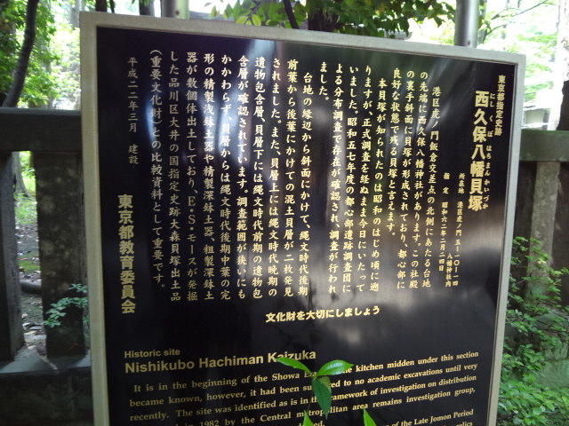 その社殿の裏手斜面に貝塚があり、都の史跡に指定されている旨の表示がありました。