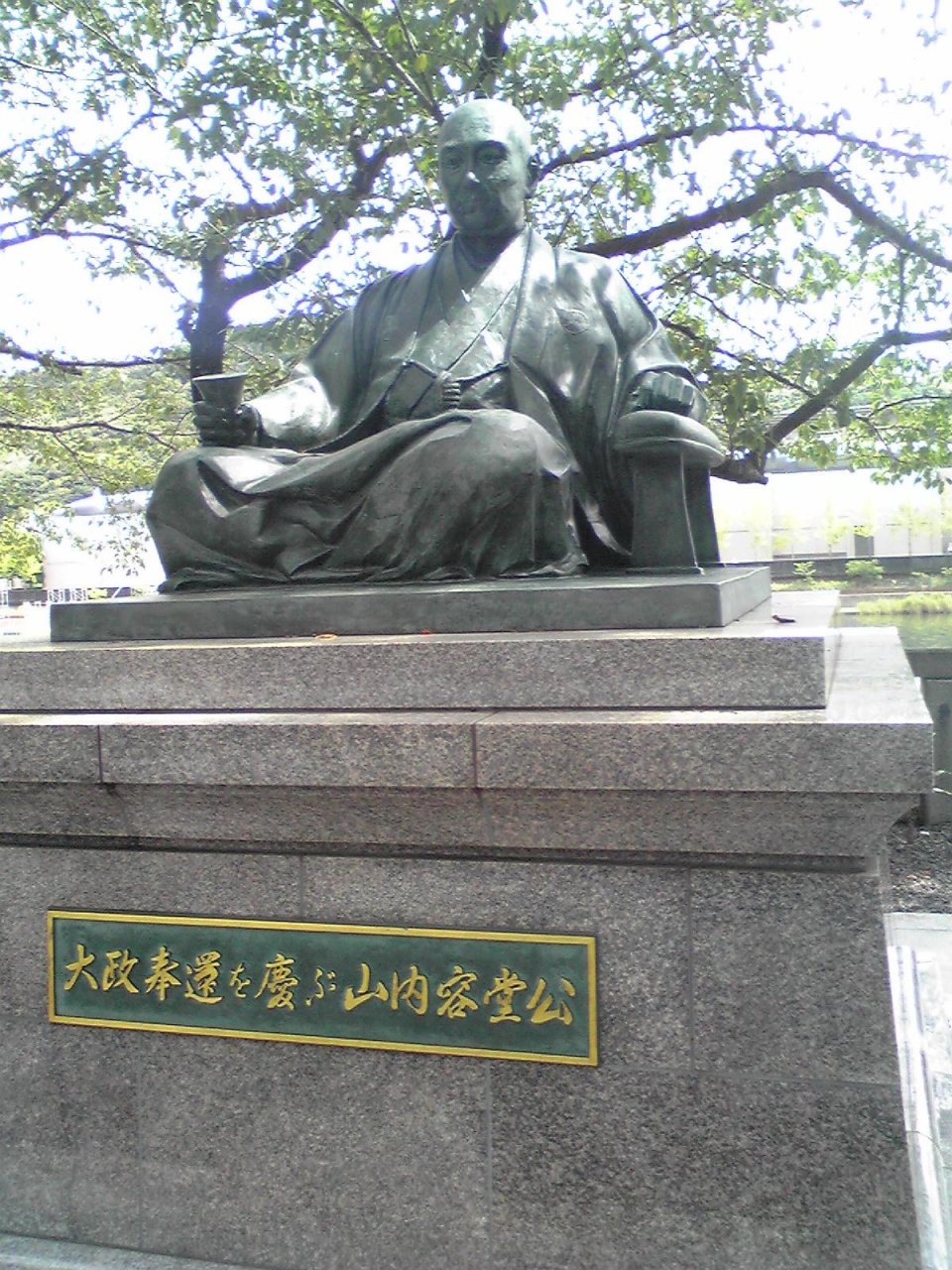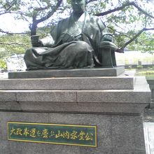 高知城下の山内家の下屋敷から歩いてすぐのところにある山内神社の境内にあります。どっかと座っている姿は、まさに大酒飲みであります。山内神社にもそのことからか多くのお神酒が供えられています。高知城からもそんなに遠くないのでセットで訪れるといいと思います。