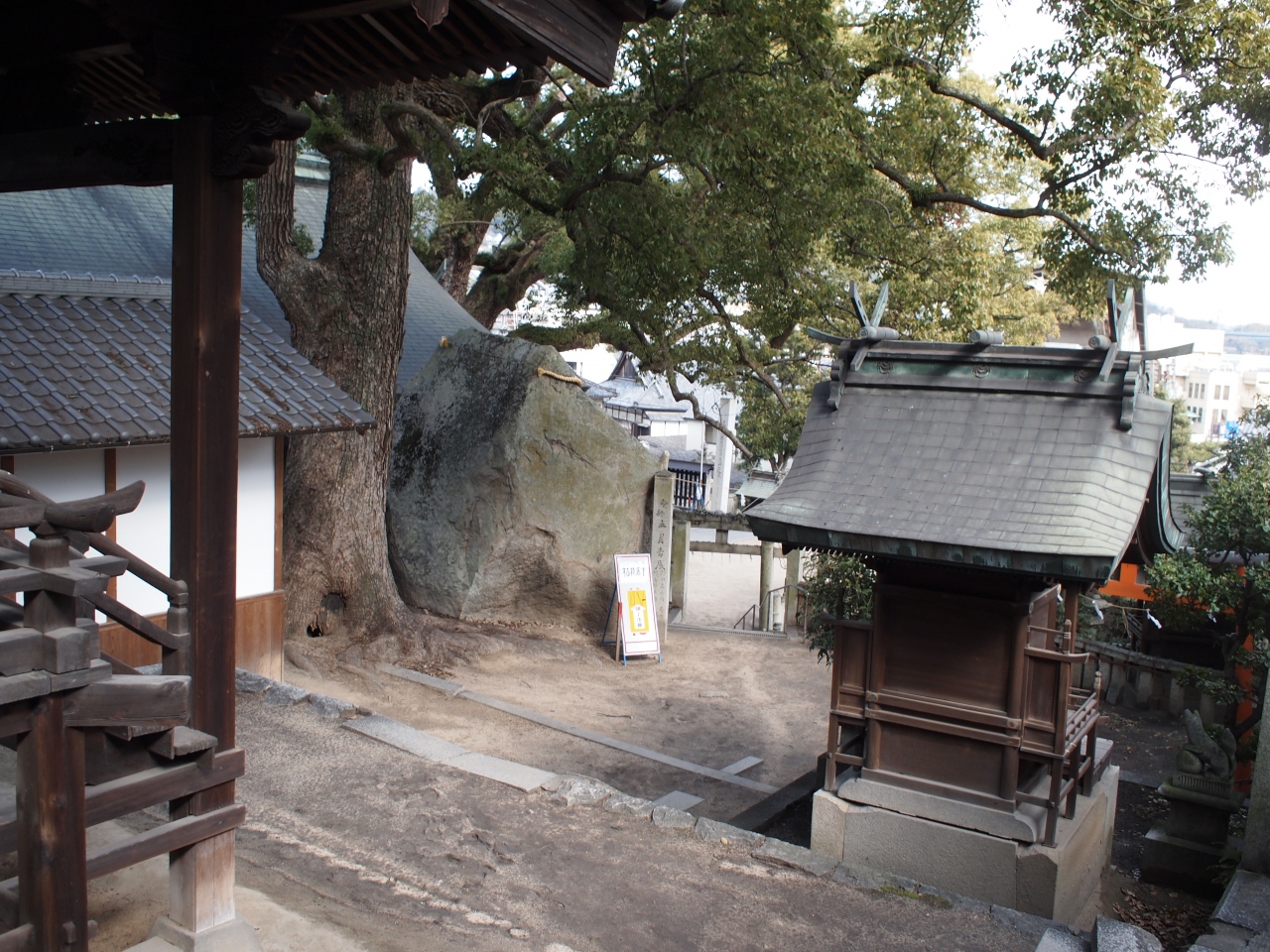 千光寺から猫の細道の急坂を下っていくと、終点のロープウェイ山麓駅近くにこの神社がありました。尾道で一番古い神社らしく、境内の雰囲気は木々に包まれたうっそうとした感じです。大きな楠は樹齢900年らしく、「時をかける少女」「ふたり」といった映画のロケ地でもあったようです。
