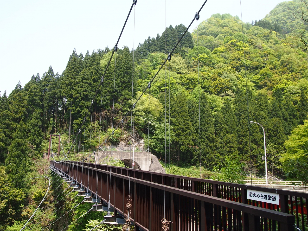 宇奈月温泉街を散策した際、山彦橋を渡ってすぐ、旧トロッコのトンネルに入る直前にあった"詩の道遊歩道"と書いてある吊り橋がありました。 この吊り橋を渡って、遊歩道を歩いていくと、また違った角度から宇奈月温泉街の自然を楽しむことが出来ます。 ただ、誰もいないところを入っていくので、熊よけの鈴が必要かも!?