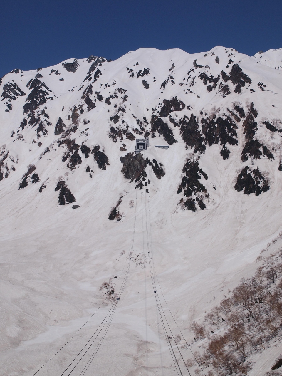 建物の中から、階段を上っていく展望台からは、雪景色一色の山の景色! かなり遠くから、立山ロープウェーのケーブルがのびているのがなかなか不思議な景色でした!