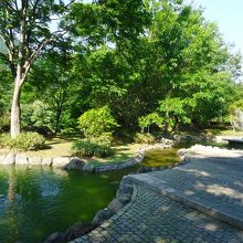 白石川に面し、駐車場から行くとすぐ、材木岩の手前にあります。大きな噴水と小さな噴水があります。所々に人口の小川が流れています。ほとんどが石畳になっているので足元には注意が必要です。