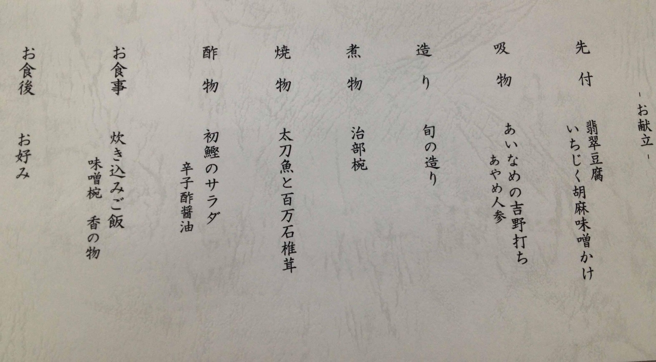 先付二種、吸物、造り、煮物、焼物、酢物、ご飯、汁、香の物、デザート
